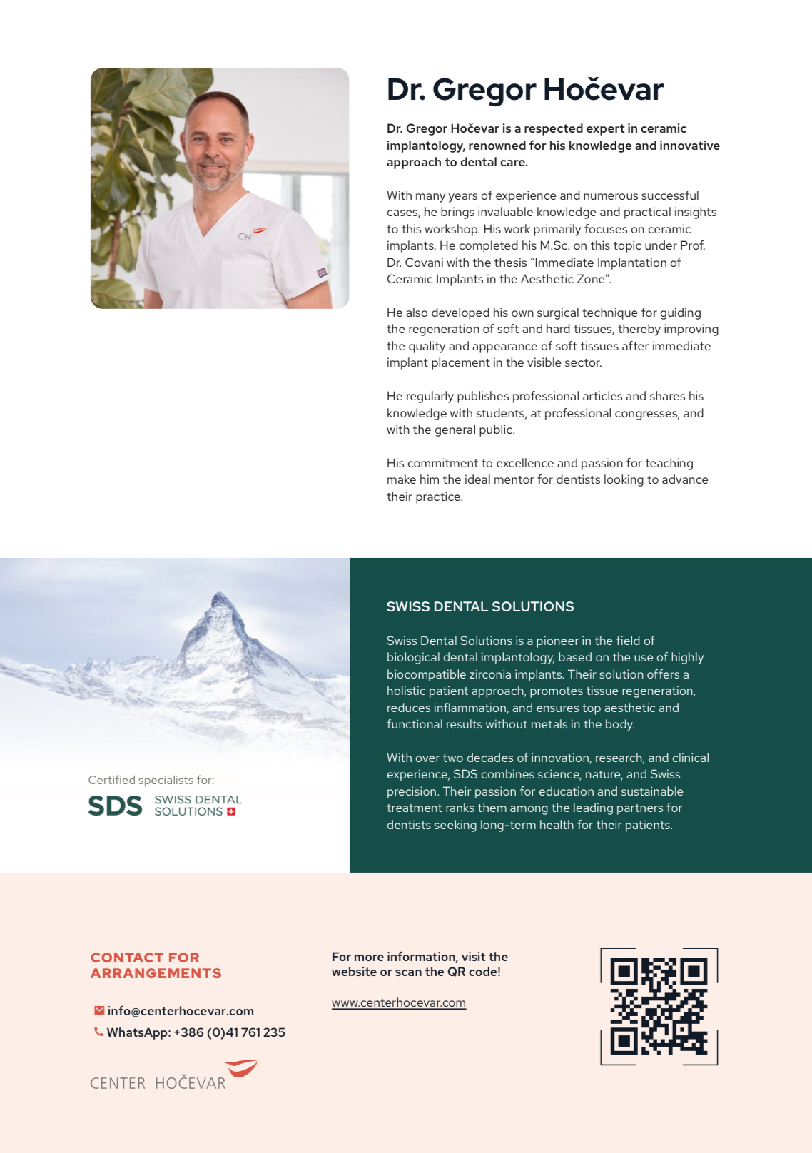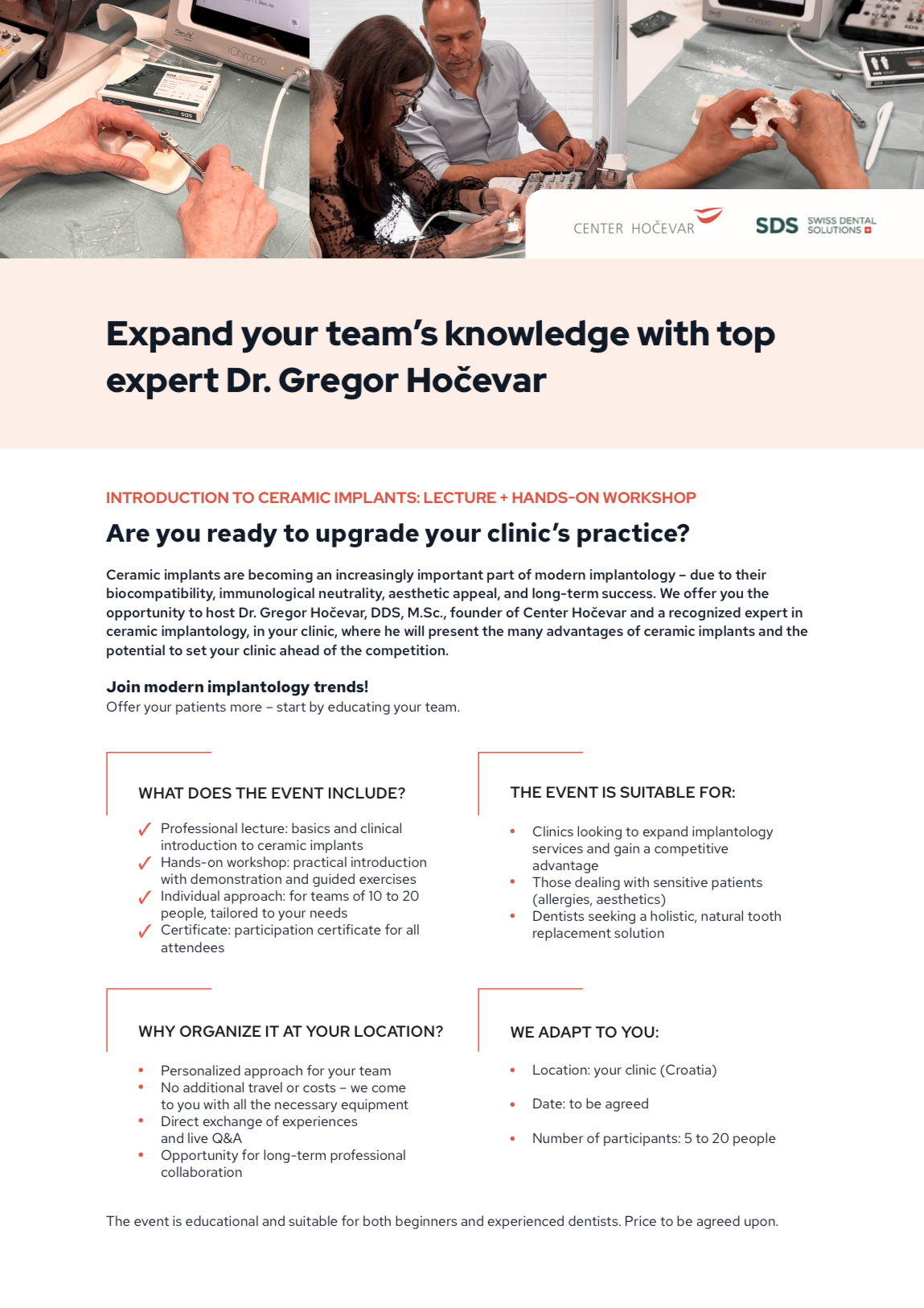 We invite you to host a personalized ceramic implantology training directly at your clinic – led by Dr. Gregor Hočevar, DDS, M.Sc., a recognized expert in ceramic implants and biological dentistry.