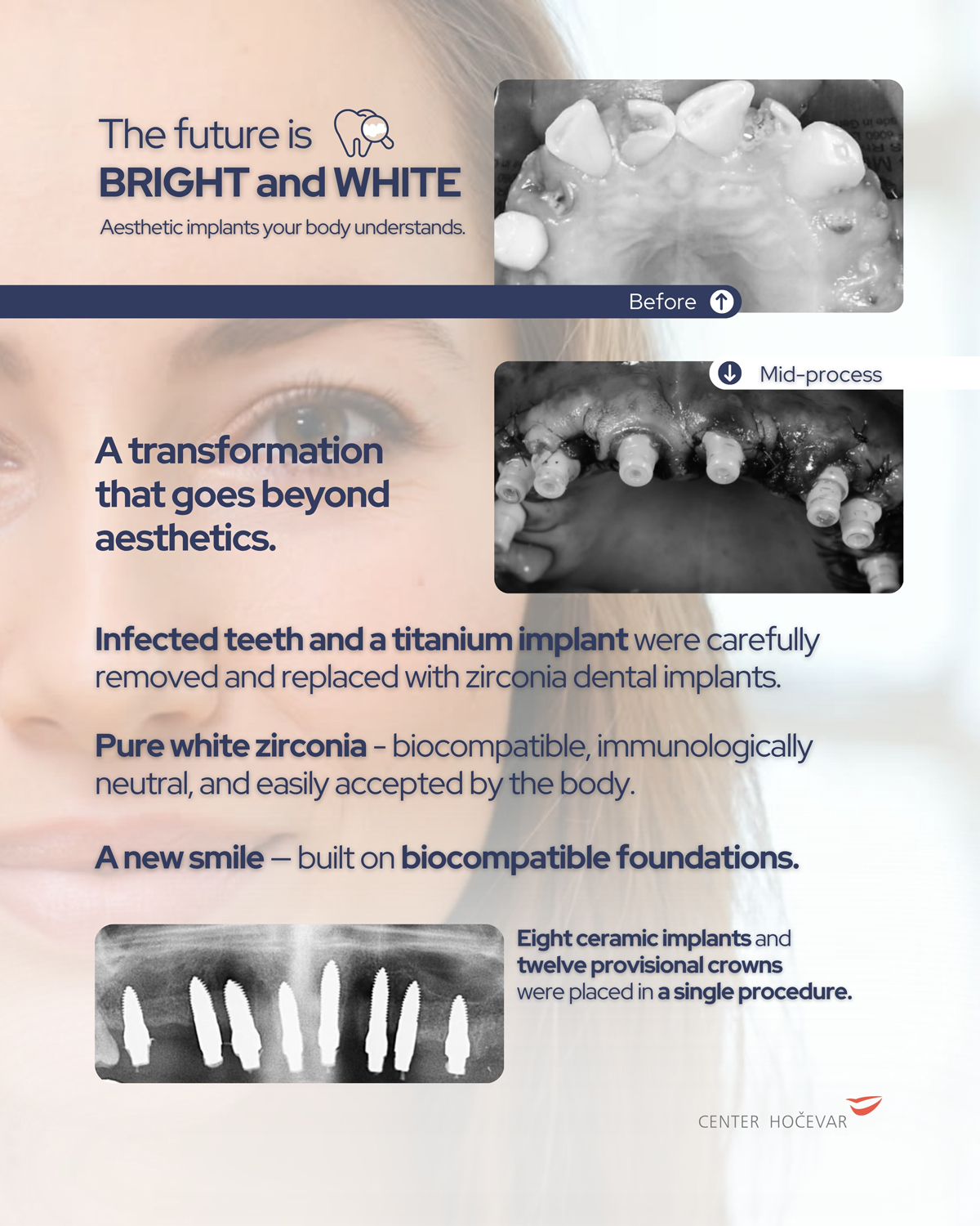 The smile was then fully restored using ceramic implants made from pure zirconia.
